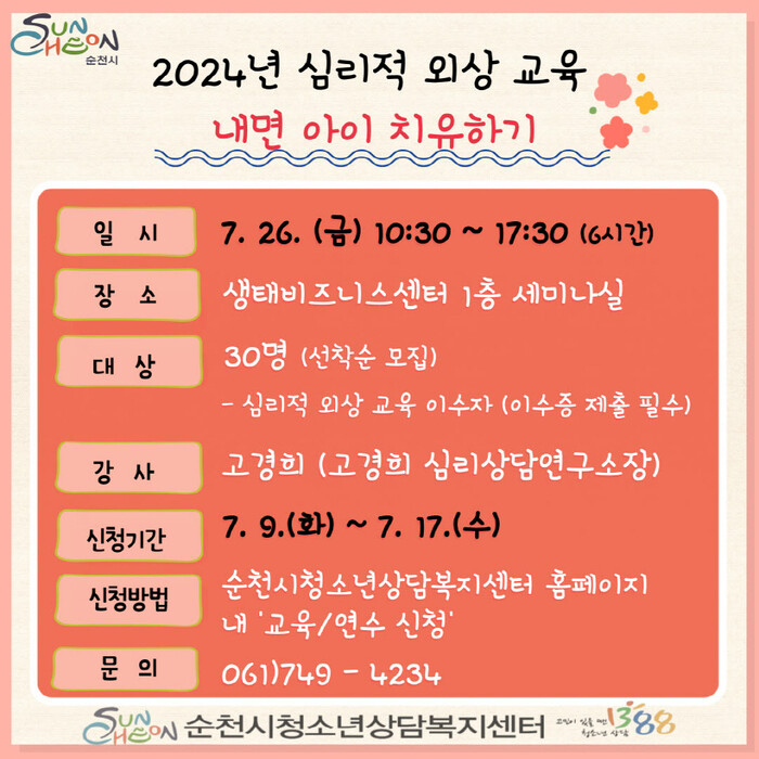 순천시청소년상담복지센터는 트라우마를 경험한 청소년들에게 전문적인 상담 개입을 위해 2020년부터 매년 심리적 외상 기초교육 및 심화과정을 실시했다.