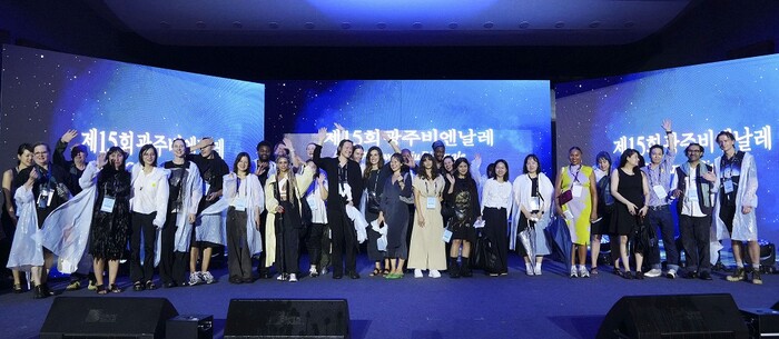 | ▲ 제15회 광주비엔날레 개막식이 6일 오후 북구 중외공원야외공연장에서 열린 가운데 전시 참여 작가들이 무대에서 인사를 하고 있다./광주광역시 제공 |