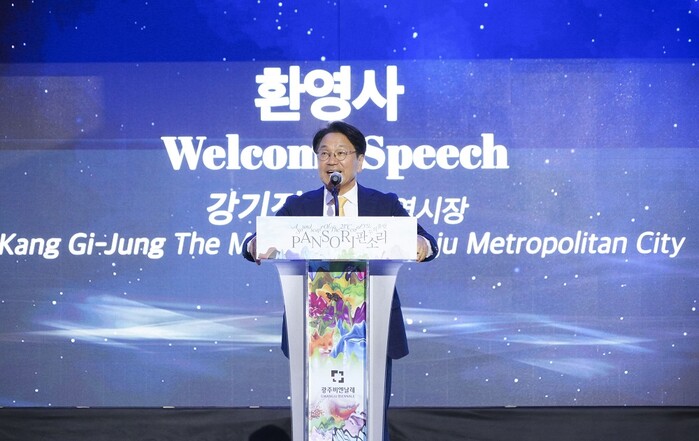 | ▲ 강기정 광주광역시장이 6일 오후 북구 중외공원야외공연장에서 열린 제15회 광주비엔날레 개막식에 참석해 환영사를 하고 있다./광주광역시 제공 |