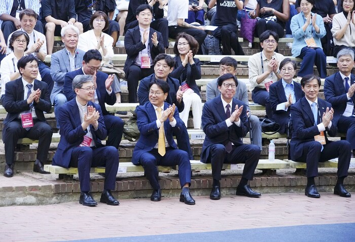 | ▲ 강기정 광주광역시장(앞줄 왼 쪽부터 두 번째)이 6일 오후 북구 중외공원야외공연장에서 열린 제15회 광주비엔날레 개막식에 박형준 부산시장, 조국 조국혁신당 대표 천하람 개혁신당 의원과 행사를 관람하고 있다./광주광역시 제공 |