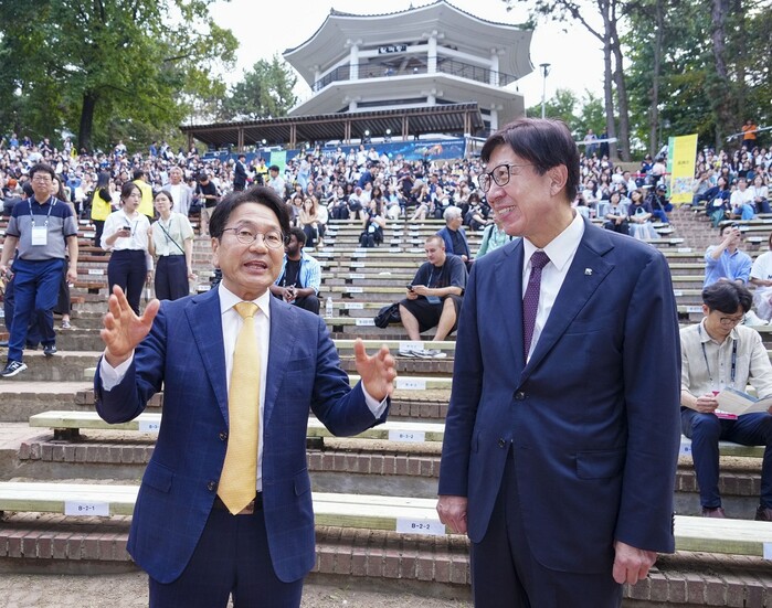 | ▲ 강기정 광주광역시장(왼쪽)과 박형준 부산광역시장(오른쪽)이 6일 오후 북구 중외공원야외공연장에서 열린 제15회 광주비엔날레 개막식에 참석해 대화를 하고 있다./광주광역시 제공 |