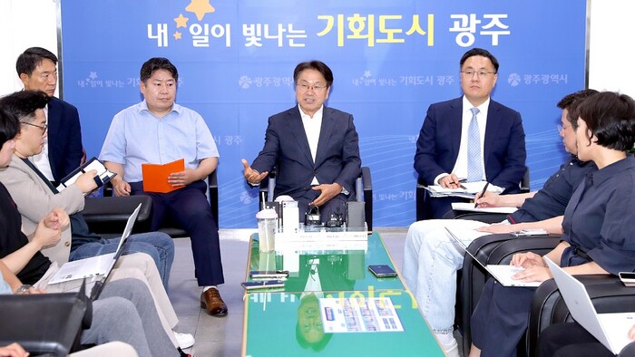 | ▲ 강기정 광주광역시장이 3일 오전 시청 5층 기자실에서 출입기자들과 차담회를 갖고 시정 주요현안 등에 대해 설명하고 있다./ 광주광역시 제공 |