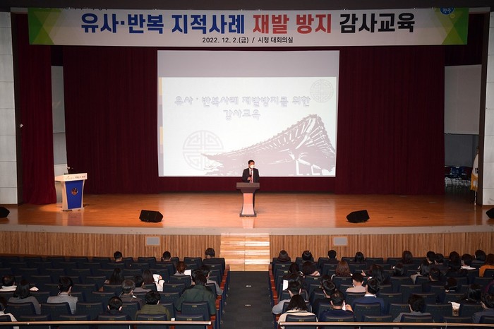 | ▲ 광주광역시는 2일 오후 시청 대회의실에서 시·자치구·지방공공기관 임직원 400여 명을 대상으로 유사‧반복 지적사례 재발 방지 감사교육을 실시했다./광주광역시 제공 |