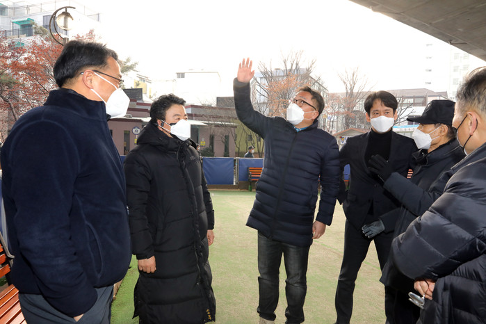 | ▲ 이종석 의회운영장 및 관계자들이 홍제3동 게이트볼장을 방문해 현장을 둘러보고 있다. (사진제공=서대문구의회) |