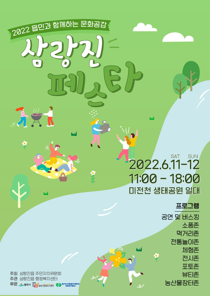 밀양시 삼랑진읍 에서는 오는 11일 ~ 12일, 이틀간 삼랑진읍 미전천 생태공원 일원(송지리151-1)에서 2022 읍민과 함께하는 문화공감 ‘삼랑진 페스타’를 개최한다고 밝혔다.