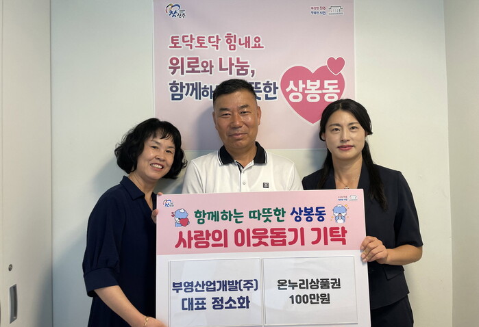 진주시 상봉동 행정복지센터는 9일 부영산업개발(주)의 정소화 대표가 다가오는 추석 명절을 맞아 관내 도움이 필요한 이웃들에게 전달해달라며 온누리상품권 100만 원을 기탁했다고 밝혔다.