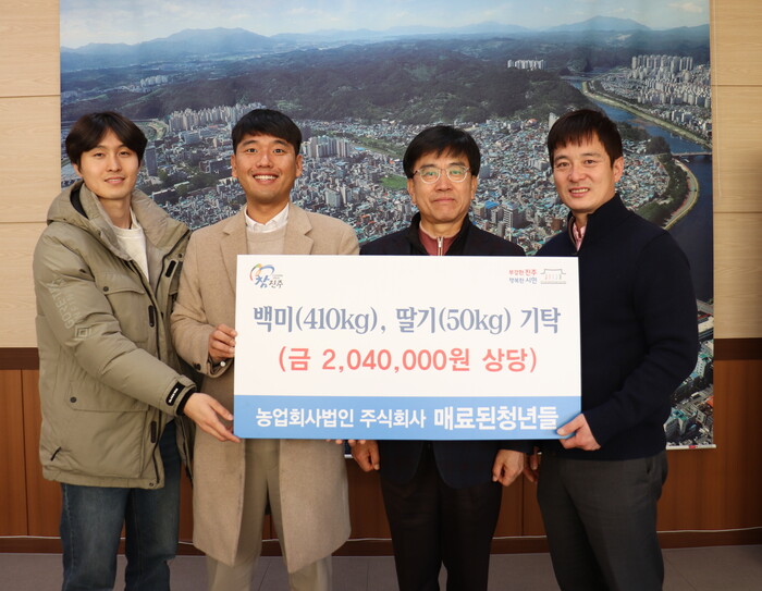 농업회사법인 ㈜매료된청년들(대표 정동훈)은 11일 지역사회 소외된 이웃에게 전달해 달라며 백미 410kg, 딸기 50kg(210만 원 상당)을 진주시복지재단(이사장 이성갑)에 기탁했다.