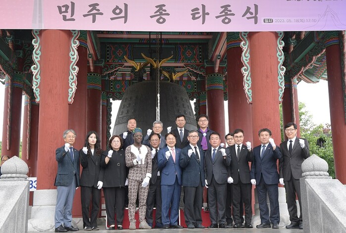 | ▲ 강기정 광주광역시장이 18일 오후 5·18민주광장 내 민주의 종각에서 5·18민주화운동 43주년을 맞아 정무창 시의회의장, 5·18단체회원들과 함께 민주의 종을 타종 후 기념 촬영을 하고 있다. /광주광역시 제공 |