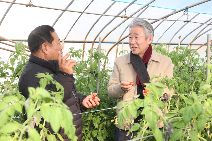 | 강호동 농협중앙회장이 5일 충남 논산 토마토하우스에서 농협 보급형 스마트팜 시설에 대한 설명을 듣고 있다.(농협 제공) |