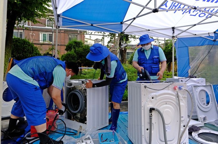 | ▲ 삼성전자서비스 직원들이 서울 관악신사시장 인근에서 수해 전자제품 무상점검 및 수리를 하고 있다.(사진제공=삼성) |