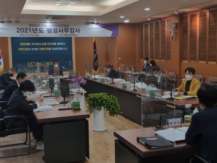 전라남도의회 기획행정위원회는 지난 12일 오후 전남도립대를 찾아 도립대의 행정사무감사에서 소속 위원들은 도립대의 방만한 운영행태와 현안 문제점에 대해 질타했다.