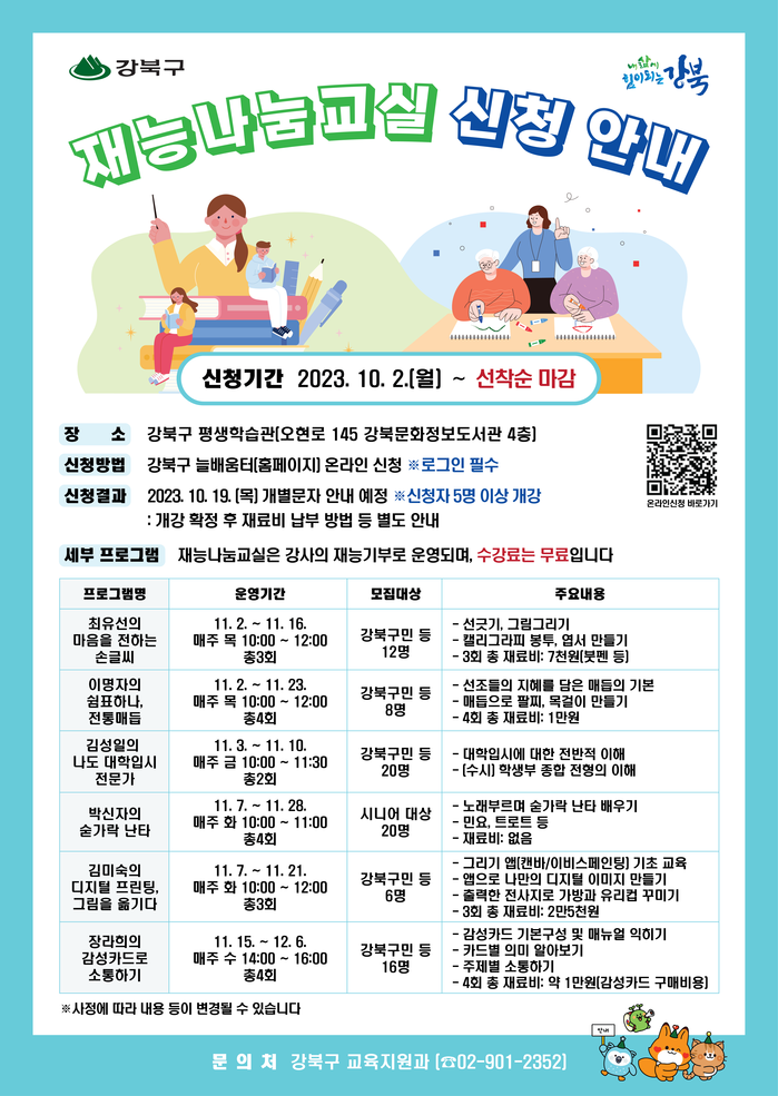 [시민일보 = 홍덕표 기자] 서울 강북구(구청장 이순희)가 2023년 재능나눔교실을 열고 오는 10월2일부터 수강신청을 받는다.
