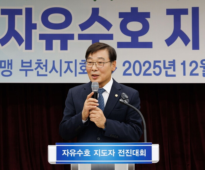 | 김병전 의장이 자유 수호 지도자 전진 대회에 참석, 축사를 하고 있다. [사진=부천시의회] |