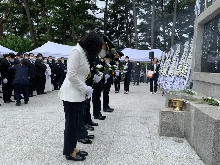 이날 추념식은 춘추공원 내 현충탑에서 박정미 서장과 각 과장ㆍ단장ㆍ담당ㆍ119안전센터장 등이 참석한 가운데 KF94 이상의 마스크 착용과 손 소독 등 코로나19 방역 수칙을 철저히 준수하며 진행됐다.