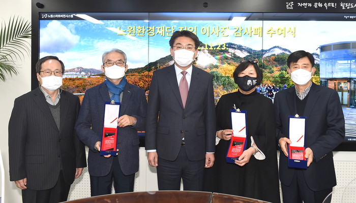 오승록 서울 노원구청장은 지난 23일 노원환경재단 운영과 관련한 현장의견을 수렴하고, 임기만료인 이사들에게 감사패를 수여하기 위해 노원환경재단 이사들과 간담회를 열었다. 사진은 간담회에서 오 구청장(가운데)이 임기만료 이사들에게 감사패를 수여한 뒤 기념촬영을 하는 모습. (사진제공=노원구청)