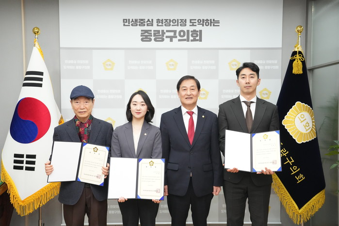 | ▲ (오른쪽부터) 이원석 결산검사위원, 조성연 중랑구의장, 결산검사 대표위원을 맡은 신예진 중랑구의회 의원, 김형숙 결산검사위원이 기념촬영을 하고 있다.(사진제공=중랑구의회) |