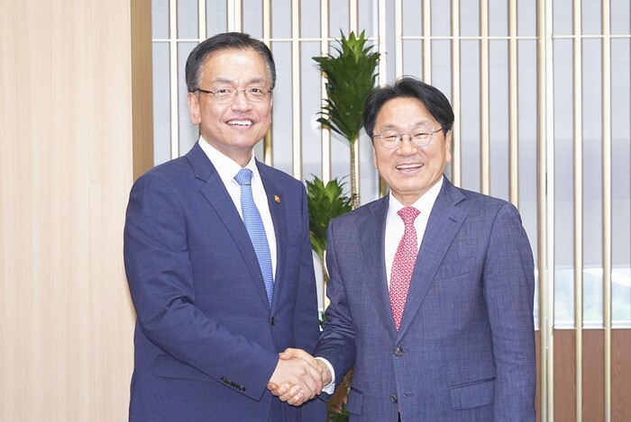 | ▲ 강기정 광주광역시장(오른 쪽) 24일 오후 정부세종청사에서 최상목 경제부총리 겸 기획재정부 장관을 만나 내년도 광주시 주요 현안사업에 대한 국비 지원 협조 요청한 후 기념촬영 /광주광역시 제공 |