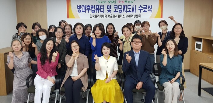 | ▲ 한국폴리텍대학 서울강서캠퍼스 오지영 교학처장, 빅데이터과 이협건 교수와 방과후컴퓨터&코딩지도사 교육과정을 수료한 학생들이 수료식 기념촬영을 하고 있다. |