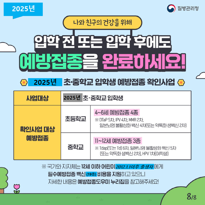 중학교 입학생은 11~12세에 시행하는 예방접종 3종(Tdap(또는 Td) 6차, 일본뇌염 불활성화 백신 5차 또는 약독화 생백신 2차, HPV 1차(여학생 대상))의 완료 여부를 확인해야 한다.