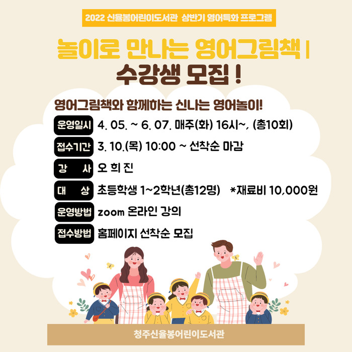 청주신율봉도서관에서는 4월 5일부터 상반기 영어 특화 프로그램 ‘놀이로 만나는 영어 그림책!’을 운영한다.