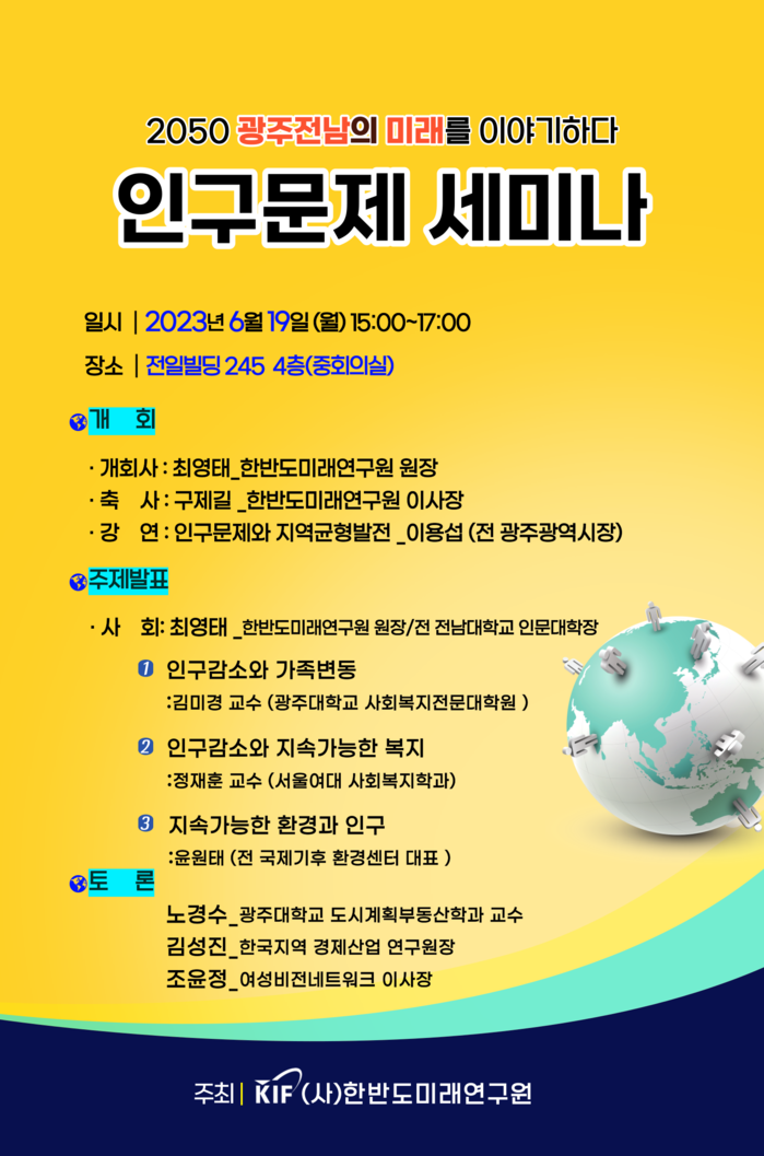 이날 세미나는 이용섭 전 광주광역시장이 “인구문제와 지역균형발전”이라는 주제로 특강을 한 후 세 명의 전문가가 인구문제에 대한 발표를 한다.