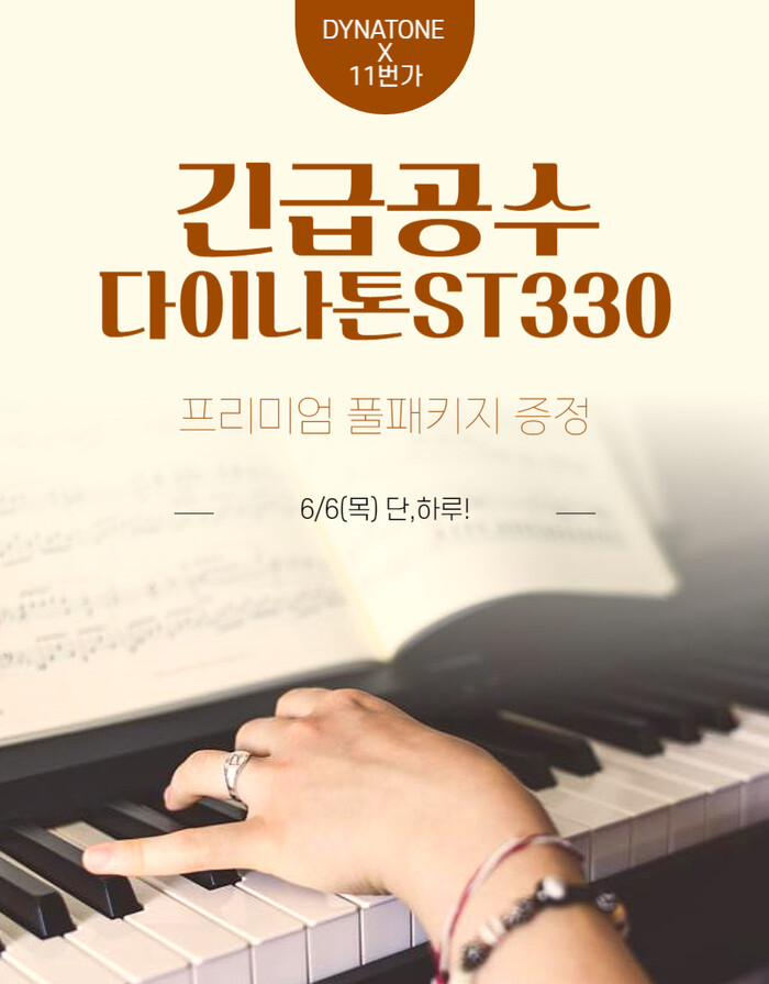 [시민일보 = 이창훈 기자] 종합악기 전문 브랜드 다이나톤이 오는 6일 하루동안 11번가에서 베스트셀링 디지털피아노 ST330의 특별 행사를 진행한다고 밝혔다.