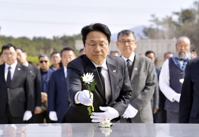 | ▲ 강기정 광주광역시장이 16일 오후 북구 운정동 국립5·18민주묘지 민주의 문 앞에서 열린 '제43주년 5·18민중항쟁기념행사위원회 출범식'에 참석해 묘역에 참배를 하고 있다./광주광역시 제공 |