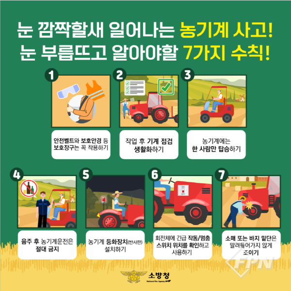 이에 소방서는 ▲작업 시 주변 위험요소 제거 ▲적절한 휴식 ▲동승자 탑승과 과다 적재, 음주 금지 ▲주기적인 부품 교환 등 농기계별 안전수칙을 준수할 것을 당부했다.