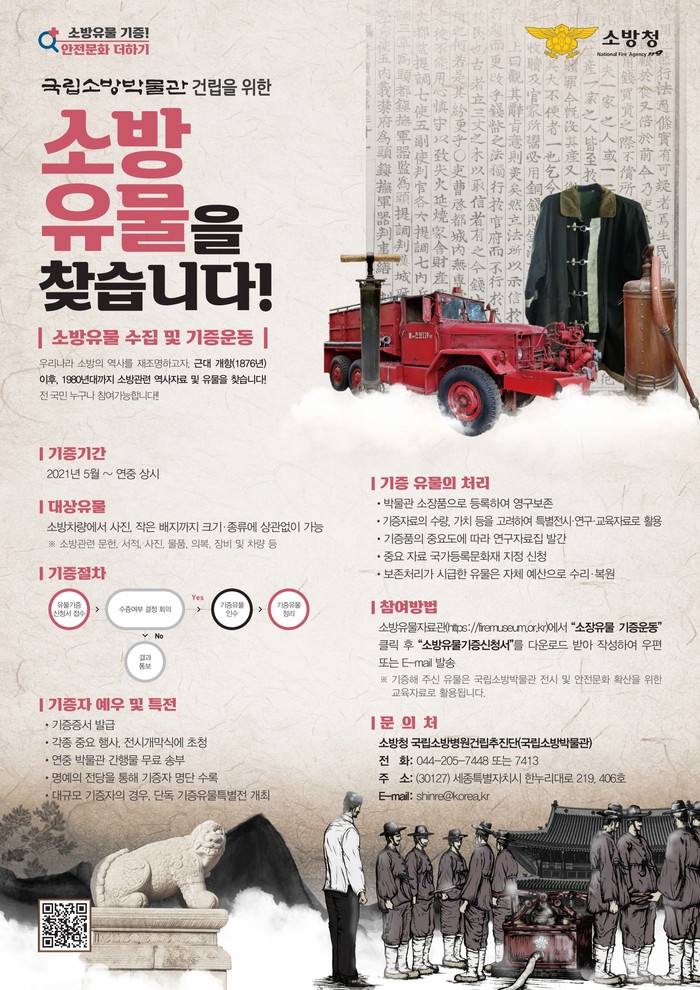 이번 소방유물 수집ㆍ기증 운동은 2024년 개관 예정인 국립소방박물관에 전시할 유물이나 소방의 변천ㆍ발전에 관한 역사적 자료 등을 발굴ㆍ보존하기 위해 마련됐다.