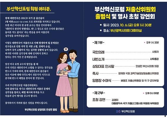 [부산=최성일 기자] 부산혁신포럼(상임고문 장제원, 상임대표 안성민)은 2023년 10월 6일(금) 13시 30분 부산광역시의회 대회의실에서 '저출산위원회 출범식 및 명사 초청 강연회'를 개최한다.