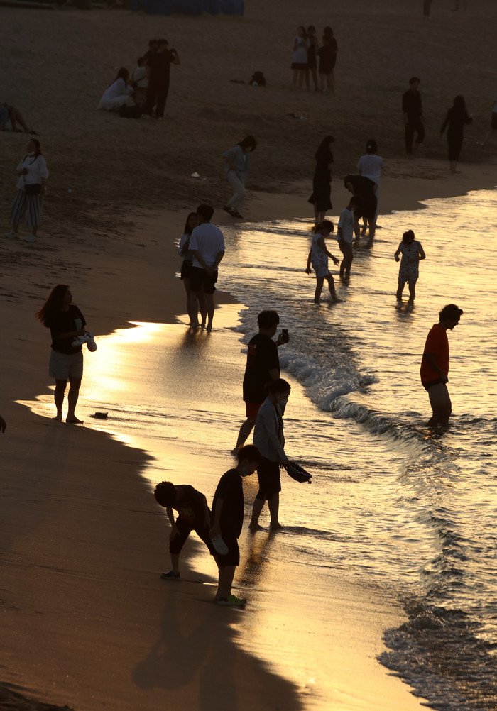 지난 2일 열대야를 피해 강원 강릉시 안목해변을 찾은 주민들이 시원한 바닷물에 발을 담근 채 무더위를 식히고 있다.