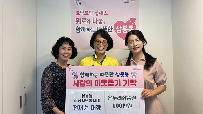진주시 상봉동행정복지센터는 12일 전재순 상봉동 여성자원봉사대장이 다가오는 추석 명절을 맞아 홀로 사는 어르신에게 전달해 달라며 온누리상품권 100만 원을 기탁했다고 밝혔다.