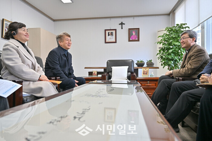 [광주=정찬남 기자] 김이강 광주광역시 서구청장(왼 쪽부터 두 번째)이 21일 서구 쌍촌동 천주교 광주대교구청에서 옥현진 대주교를 예방하고 지역사회 발전 및 협력 방안에 대해 환담을 나누고 있다. / 광주 서구 제공