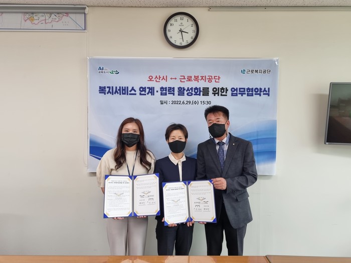 경기 오산시와 근로복지공단이 최근 복지서비스 연계·협력 활성화를 위한 업무 협약을 체결했다. 협약에 따라 양 기관은 (산재노동자) 복지서비스 대상자 발굴 및 의뢰, 복지서비스 공유·연계 등을 함께 추진할 예정이다. 사진은 최근 진행된 협약식에서 관계자들이 기념촬영을 하는 모습. (사진제공=오산시청)