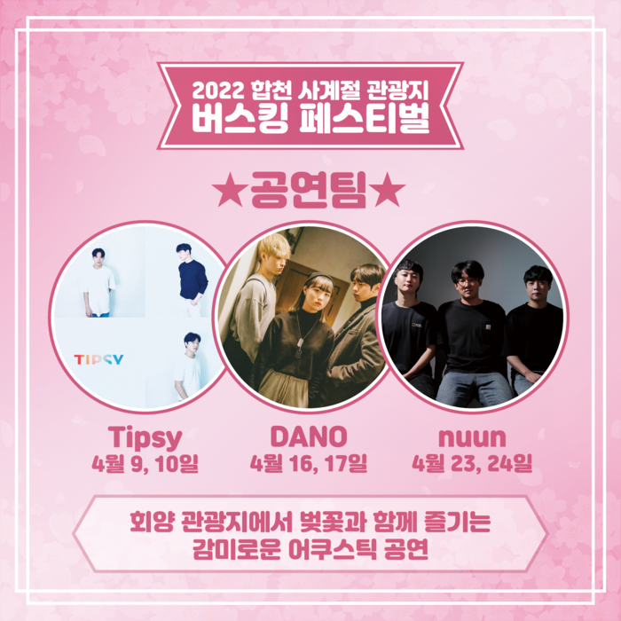 먼저 4월에는 벚꽃이 만발한 합천호 회양관광지 공연장에서는 봄에 어울리는 어쿠스틱 공연이 4월 9일부터 4월 24일까지, 3주간 주말마다 진행된다.