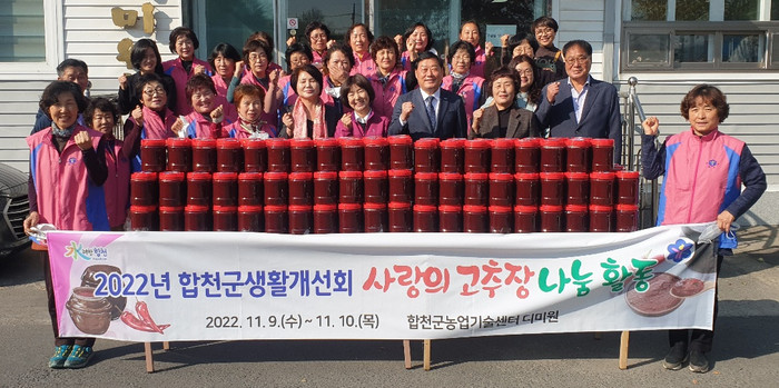 박숙자 합천군 생활개선회장과 회원 20여 명은 지난 9일 회원 농가에서 직접 재배한 고춧가루 72kg으로 고추장을 담가 숙성 과정을 거쳤다. 이튿날에는 숙성된 고추장을 개별 포장작업을 하고 읍.면 생활개선회를 통해 지역에서 홀로 지내시는 어르신과 소외된 이웃 180가구에 전달했다.