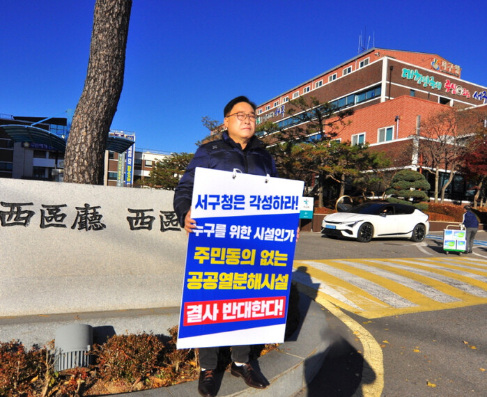 | 김춘수 의원이 공공 열분해 시설 사업 철회를 요구하는 1인 시위를 벌이고 있다. (사진=서구의회) |