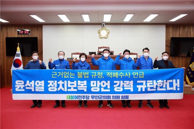 의원들은 이날 오후 무안군의회에서 규탄대회를 열고 “국민의힘 윤석열 후보가 문재인 정부에 대한 노골적인 정치보복을 공개 선언했다”며 "대통령 후보 중에 국민통합을 강조하는 후보는 봤지만, 현직 대통령을 적폐로 규정하고 수사하겠다는 후보는 처음이다"고 비판했다.