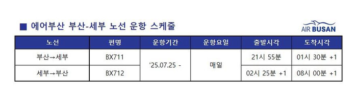 에어부산 부산-세부 노선은 김해국제공항에서 오후 9시 55분 출발해 다음날 오전 01시 30분 현지에 도착, 귀국 항공편은 현지 공항에서 오전 2시 25분 출발해 같은 날 오전 8시 김해국제공항에 도착하는 스케줄이다. 비행시간은 약 4시간 35분 소요되며, 항공기는 A321기종(220석)이 투입된다.