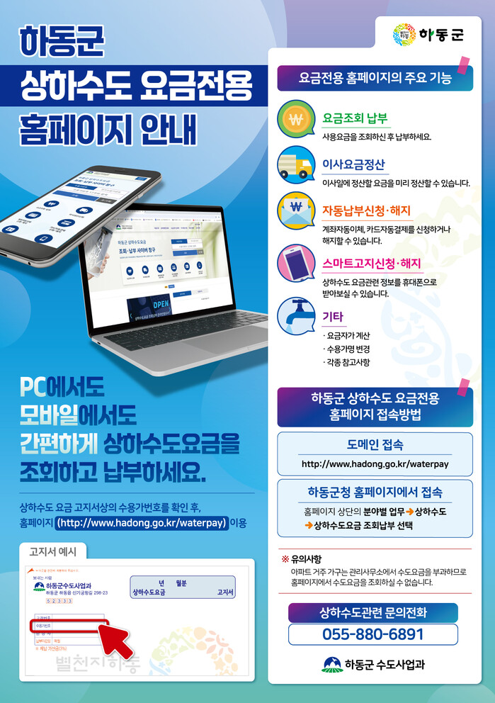 하동군이 군민들의 상하수도 요금 납부 편의를 위해 전용 홈페이지를 개설하고, 오는 7월부터 운영에 들어간다.
