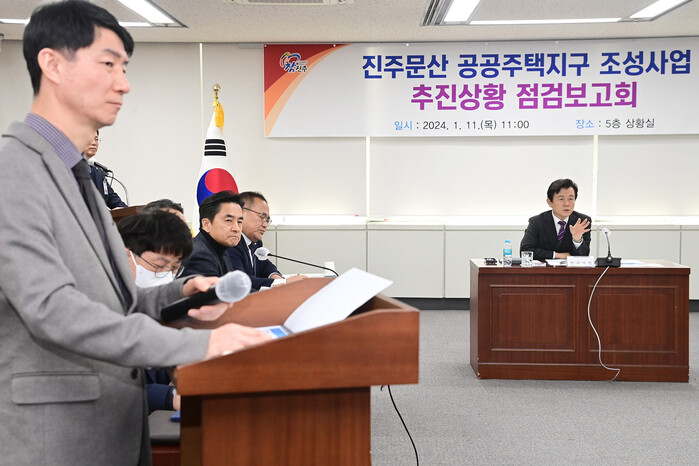 [진주=엄기동 기자] 진주시는 11일 시청 상황실에서 조규일 진주시장과 LH, 관련 부서, 용역회사 등이 참석한 가운데 ‘진주문산 공공주택지구 추진상황 점검보고회’를 개최했다.