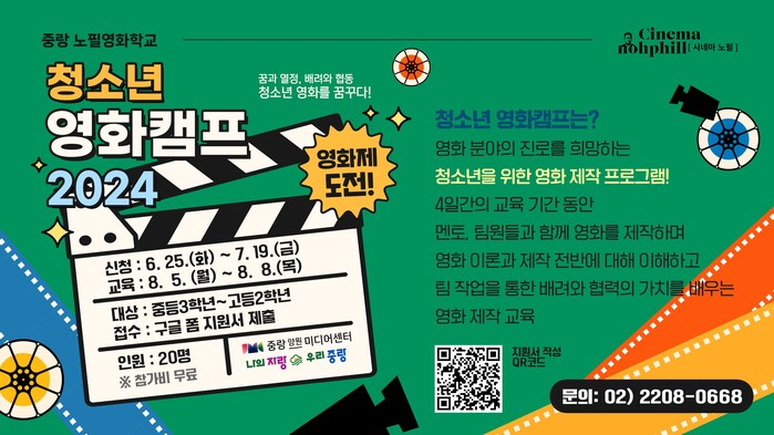 [시민일보 = 여영준 기자] 중랑구(구청장 류경기) 양원미디어센터에서 여름방학을 맞은 청소년들을 위해 '중랑노필영화학교- 청소년 영화 캠프 2024'를 진행한다.