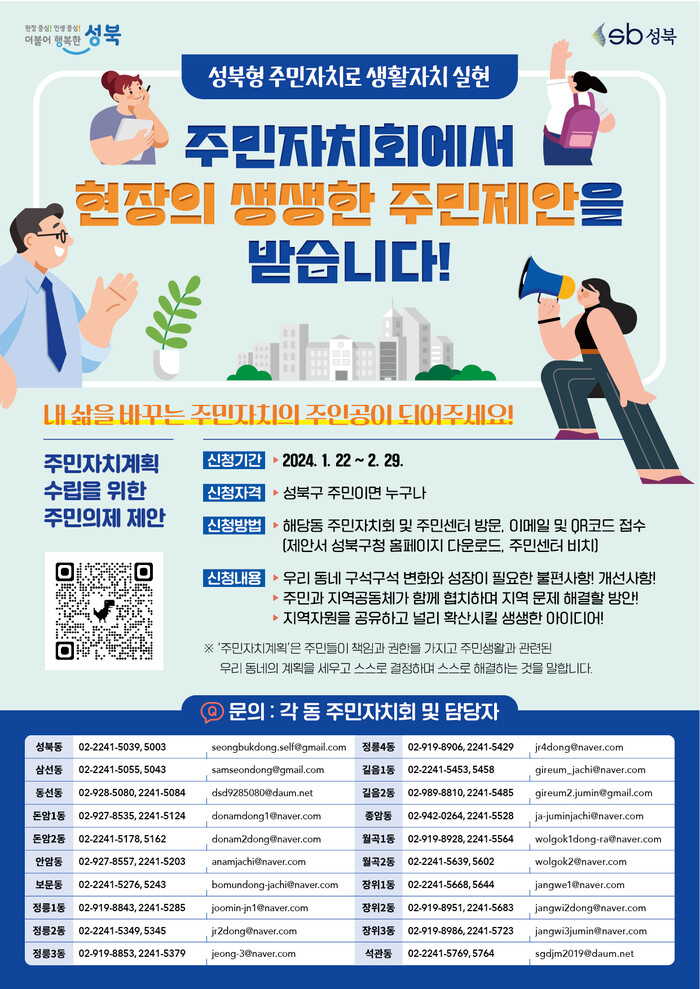 [시민일보 = 홍덕표 기자] 서울 성북구(구청장 이승로)가 오는 29일까지 성북형 주민자치계획 수립을 위한 주민의제 사업제안서를 접수받는다.