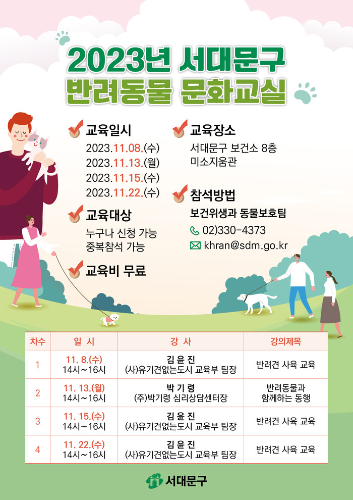 반려동물 사육자와 입양 예정자, 관심 있는 주민 등 누구나 수강할 수 있으며, 구청 홈페이지 공지사항을 참고해 이메일 또는 전화(서대문구보건소 보건위생과 동물보호팀)로 신청하면 된다.