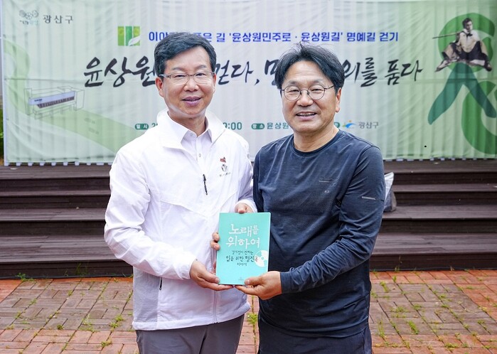 | ▲ 강기정 광주광역시장이 29일 오전 광산구 임곡동에서 열린 '윤상원길을 걷다, 민주주의을 품다' 걷기 행사를 마친 뒤 윤상원 기념관 앞에서 '노래를 위하여' 책을 박병규 광산구청장에게 전달하고 있다./광주광역시 제공 |