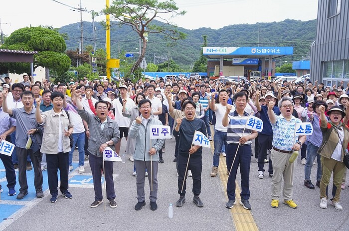 | ▲ 강기정 광주광역시장(사진 가운데)이 29일 오전 광산구 임곡동 행정복지센터에서 열린 '윤상원길을 걷다, 민주주의을 품다' 걷기 행사에 참여해 박병규 광산구청장, 정무창 광주시의회 의장, 박균택 국회의원 등 시민들과 출발에 앞서 구호를 외치고 있다./광주광역시 제공 |