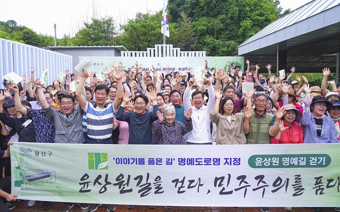 한편 광산구는 주민 의견수렴을 통해 임곡동 행정복지센터~진곡교차로 5.7㎞ 가량을 ‘윤상원민주로’로, 윤상원 열사 생가가 위치한 천동길 329m 가량을 ‘윤상원길’로 명예도로명을 부여했다. 명예도로명이란 실제 주소로 사용하지는 않지만 인물·기업 등의 사회헌신도, 공익성을 고려해 도로구간에 부여하는 별칭으로 지역의 큰 상징성을 지닌다.