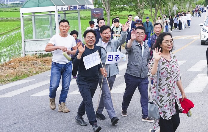 | ▲ 강기정 광주광역시장이 29일 오전 광산구 임곡동 행정복지센터에서 열린 '윤상원길을 걷다, 민주주의을 품다' 걷기 행사에 참여해 시민들과 윤상원 기념관까지 윤상원 명예길을 걷고 있다./광주광역시 제공 |