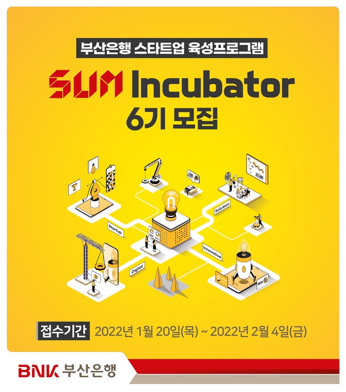 [시민일보 = 여영준 기자] BNK부산은행이 지역 스타트업 육성 프로그램인 ‘썸 인큐베이터(SUM Incubator)’ 6기를 모집한다고 20일 밝혔다.
