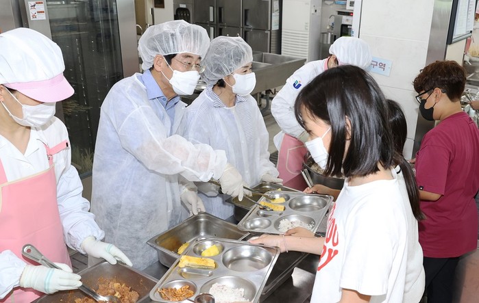 | ▲ 강진원 강진군수가 제45대 강진군수 취임식 후 강진읍 소재 중앙초등학교를 방문해 재학생들을 대상으로 배식봉사를 하고 있다. / 사진=강진군 제공 |